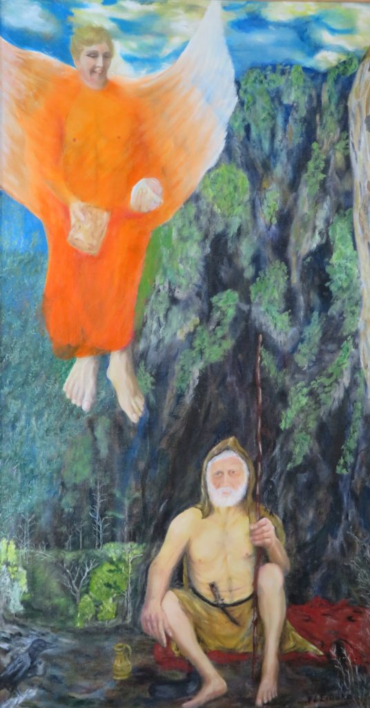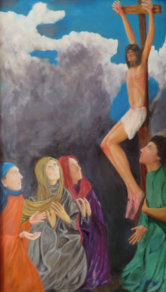 Óleo sobre lienzo 2011 medidas 118 X 72 X 5 cm Jesús crucificado , ante la mirada de su madre María ,la hermana de su madre , María Magdalena y su discípulo mas joven . ( Evangelio según San Juan 19, 16 – 30 ).
