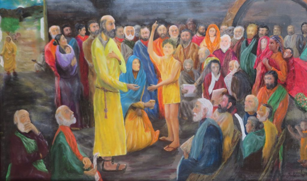 Óleo sobre lienzo. 2014 ,medidas 103 X 66 X 5 cm Después de tres días Jesús niño es hallado en el templo , hablando con los ancianos y escribas . En éste trabajo e tratado que como en todos los templos los escuchantes no todos escuchan si no están en su mundo ( bueno los menos ) ,