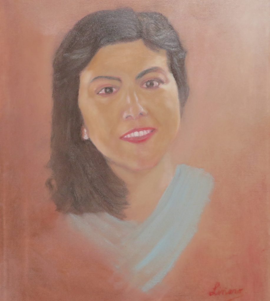 Óleo en lienzo, año 2021 – IX, medidas 75 X 63 cm Peregrina al Santuario de nuestra Señora de Lourdes