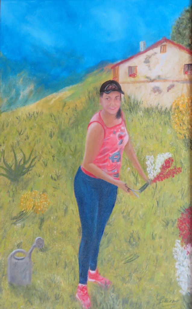 Óleo sobre lienzo año 2020- V- medidas 87 X 55 cm Viniendo de la capital el fin de semana a la casa de campo, para arreglar la huerta y de paso, coger unos ramos de flores.