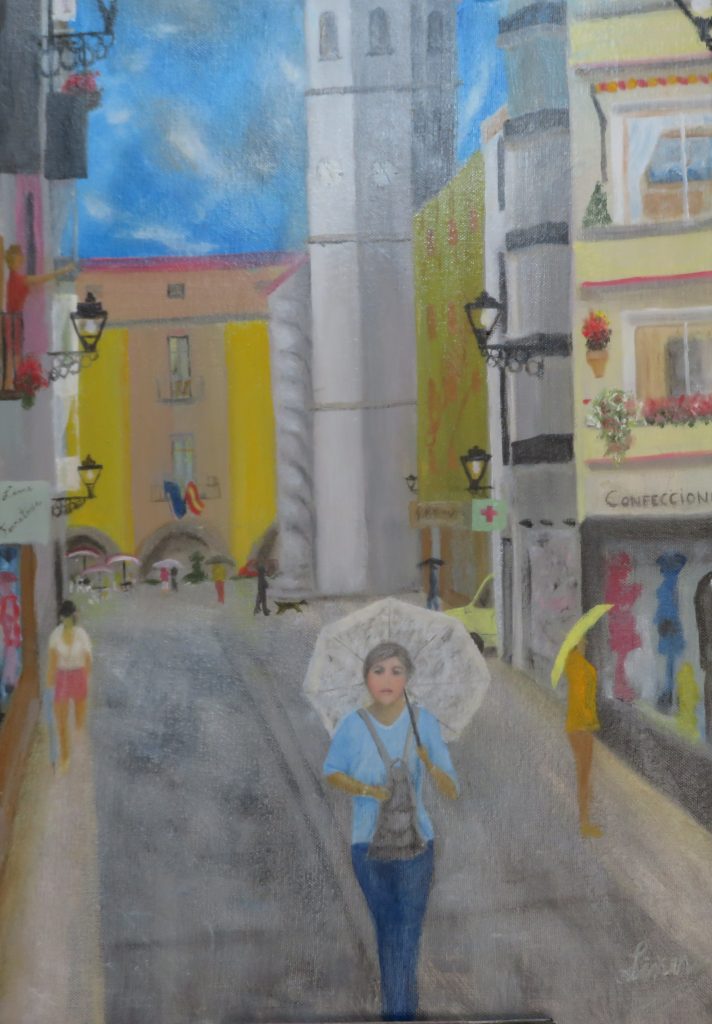 Óleo sobre lienzo año 2021- XI. Medidas 60 X 40 cm Paseando por la calle y de paso echar una miradita a los escaparates, una pena que empieza a chispear .