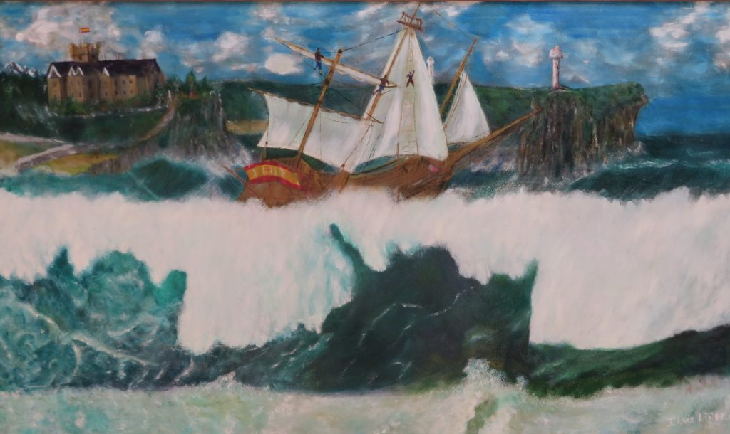 Medidas 106 X 69 cm . Salida del Puerto de Santander un velero con el viento Sur bordeando la isla de Mouro , para dentro de un par de millas poner rumbo Oeste ( Ultramar ).